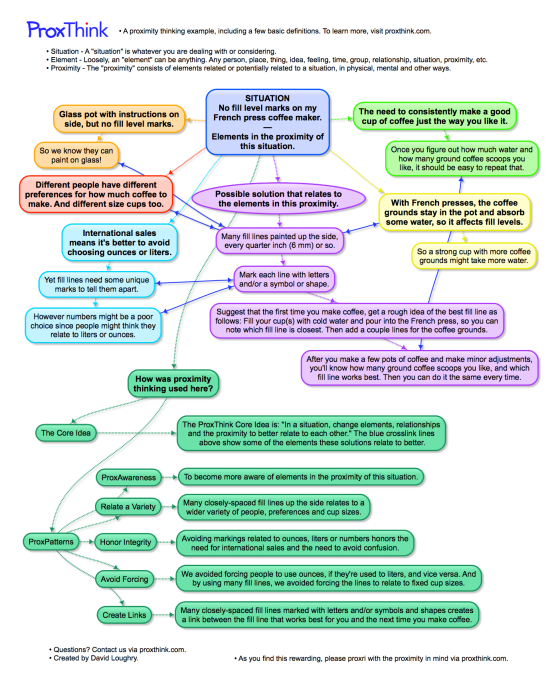 In a previous post, I talked about my French press coffee maker which has no fill level marks to help me add water to the same place every time. This short video introduces that post, and shows you my current French press. It is for people who own French press coffee makers AS WELL AS designers and anyone interested in innovation and creativity. It also shows the mind map you can explore while learning some proximity thinking at the same time!