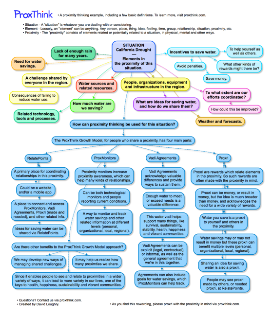 A visual asset I’m including is the Flow Graphic shown on the guide document called Using the Guide and Linked Documents. The Flow Graphic shows a looping sequence for using the growth model processes that are part of the Shared Situation Guide. By using these processes, people naturally create ongoing evidence-based monitoring and make decisions based on information related to their shared situation. It should be noted that ProxMonitors can be any combination of technological monitors and/or human monitors. Smaller scale examples of such evidence-based monitoring and relevant decision-making can be seen in two ProxThink guide starter sets found on the Shared Situations website, one for organizing a picnic and one for a shared kitchen. A larger scale example would be using the ProxThink growth model for the California drought, which could become a collaboration joined via the Shared Situations site (see this link: http://wp.me/p1Ry8Q-fI).